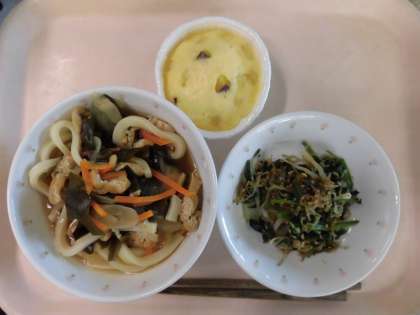 きつねうどん・ほうれん草の乾物和え・さつまいも入り蒸しパン
