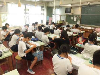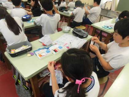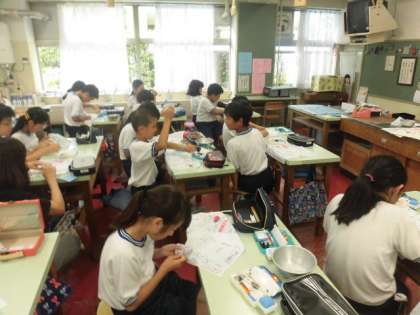 5年生も家庭科の授業。裁縫が始まりました。玉結びを覚えて、慎重に針を動かしています。初めて子もとても真剣取り組んでいます。