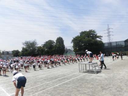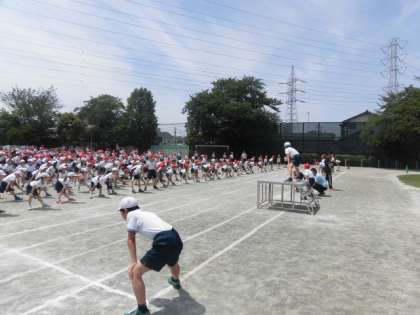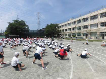 今日のハッスルタイムは、運動会の準備体操、整理体操の練習です。係の5・6年生の指示を聞いた、動きをしっかりと見ながら練習しました。