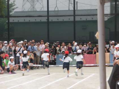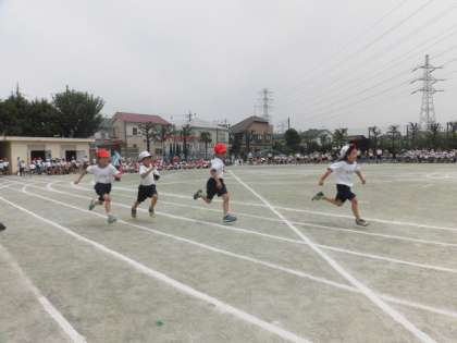 1年生は、初めての50m走。自分のコースを最後までまっすぐに走ることが目標です。ゴールの方には保護者の方がたくさん1年生が走ってくるのを待っていてくれました。ゴールテープを切ってからも走り抜けることもできていて素晴らしかったです。