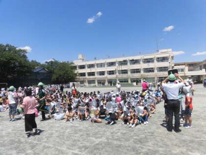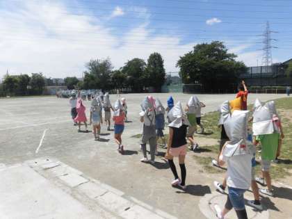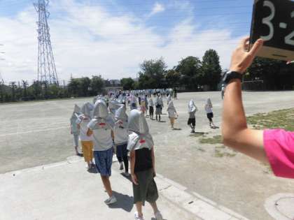 6月の避難訓練は、理科室からの出火を想定した火災です。ハンカチを口に当て、静かに避難することができました。