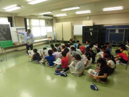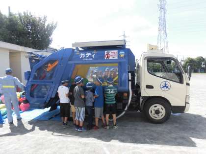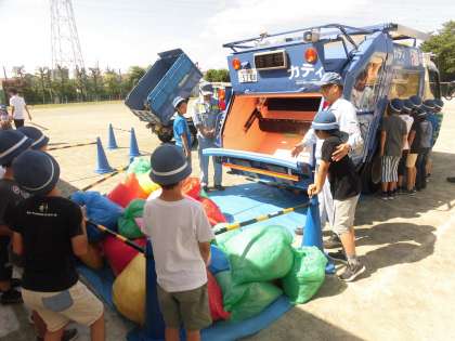 総合的な学習で環境問題について、社会科でごみの処理について学習する4年生。今日は清掃事務所の方に来ていただいての授業です。ごみ収集車の内部の様子が見れる「カティ」も学校に来ました。学級ごとに集会室と校庭に分かれてごみ収集にかかわる話をきいたり体験したりしながらしっかりと学びました。