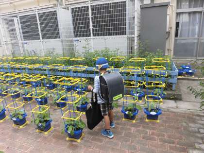 1年生が育てているアサガオ、つるが伸びてきたので支柱を立てました。支柱にそってつるがどんどん伸びてきています。花が咲くのが待ち遠しいです。緑のカーテンもどんどん上へ上へと伸びています。