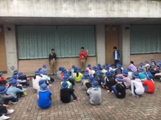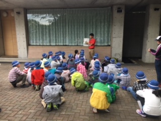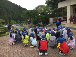 里山散策に出発。ビレジの方の案内で、二つのグループに分かれて、ふじやまビレジの周りを散策します。