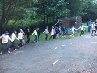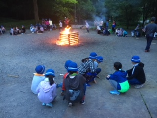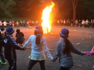 1日めの最後のお楽しみ、キャンプファイヤーが始まりました。4人の火の子がもらった火が大きく燃え上がる中、ダンスやゲームで盛り上がっています。