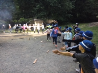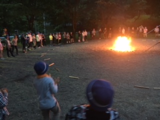 日が落ちてあたりは暗くなってきましたが、キャンプファイヤー係の頑張りで楽しい時間を過ごしています。