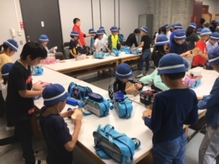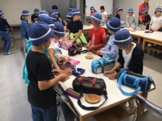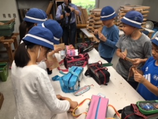 雨が降り続いているので残念でしが鉱石山登山は中止。かわりに工房で川場村の間伐材を使ったコースターづくりに挑戦です。ヤスリがけから始めます。
