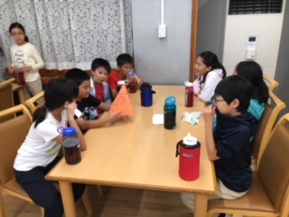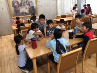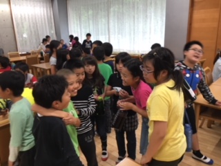 昼食を食べ終わりましたが、天候が回復しないので午後は、1時からレクリエーション大会を村の会堂で行います。急遽、行動班で出し物をすることになり、食堂で相談しています。