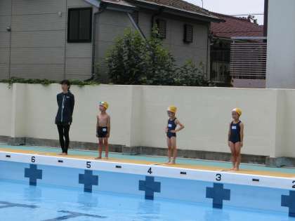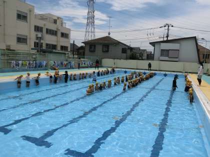 梅雨の谷間の晴れが続き、待ちにまったプール開きでした。1年生にとっては、はじめてのプール、先生のお話をしっかりと聞いて楽しいプールになりました。