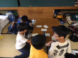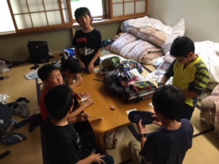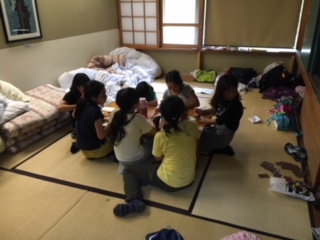 レクリエーション大会を終えて、部屋に戻ってハガキ書きです。移動教室の感想をしたためています。ハガキがつくのは、子どもたちが東京に帰ったあとになりますが、楽しみに待っててください。