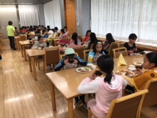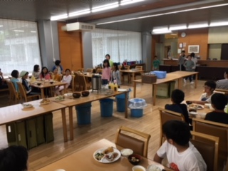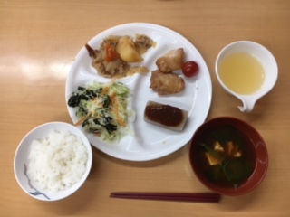 二日めの夕食です。食事係も手順がよくなりました。献立は、ご飯、鶏の照り焼き、肉じゃが、わかめのサラダ、豆腐と青菜の味噌汁、こんにゃく、ミニトマト、りんごジュースです。残さずいただきます。