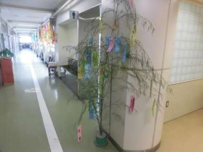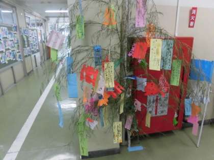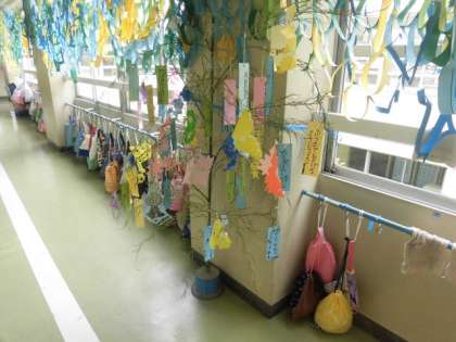 もうすぐ7月7日の七夕です。1年生の教室の廊下などには、笹飾りが飾られています。たくさんの願い事、かなうといいですね。