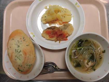 ガーリックトースト・魚のエスカベージュ・パセリポテト・ビーフンスープ