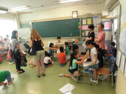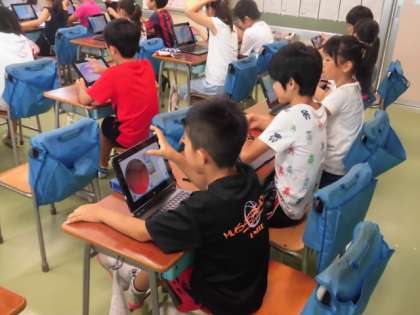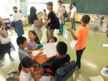 1学期最後の土曜授業。暑い中、ご来校いただきありがとうございました。写真は、3年生の総合「まち探検」の発表会と4年生のタブレットを使ったプログラミングソフトの活用の授業です。
