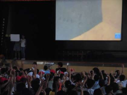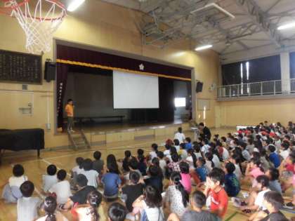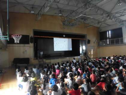 1学期最後のゲーム集会を体育館で行いました。集会委員が学校にあるものカメラで撮影して、ズームアップしたものが何かを3択で当てるクイズです。みんな、何か真剣に考えて答えていました。