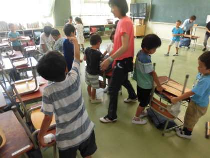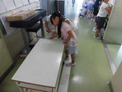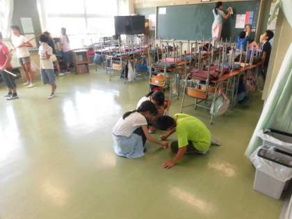 1学期にみんなで生活してきた教室をみんなできれいにしています。机やいすを廊下にだして徹底的にきれいにしています。配膳台もピカピカです。