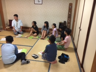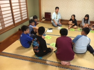 班長会議をしています。今日頑張ったこと、できなかったことを発表しています。明日に生かしていきましょう。今日の活動は、これで終わりです。明日に備えてゆっくり休みましょう。