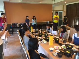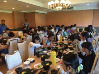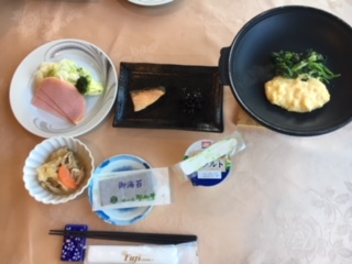 朝食です。朝早くから用意してくださいました。しっかり食べてハイキング頑張りましょう。献立は、スクランブルエッグ、ロースハム、温キャベツ、ブロッコリー、肉じゃが、焼き魚、切りこんぶ、焼きのり、ご飯、ヨーグルトです。いただきます。