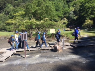 湯元の源泉に到着。硫黄の匂いがします。