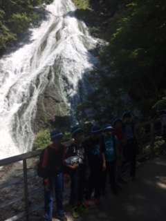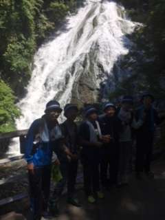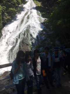 湯滝の下に到着。滝の水量が多いです。マイナスイオンを浴びながら、班ごとに写真を撮っています。