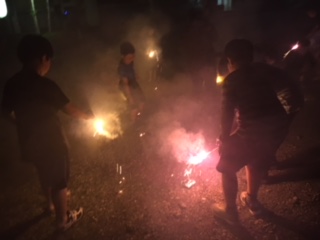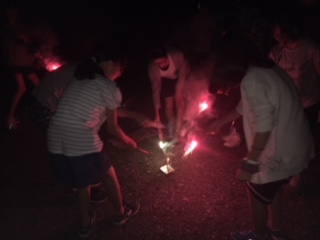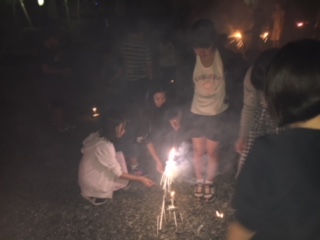 2日めの最後のプログラムは、花火です。グループごとに手持ち花火をしています。