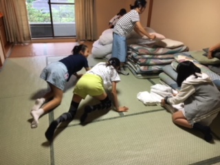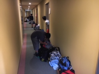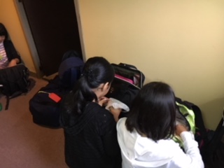 荷物整理をしています。大きなリュックと小さなリュックを廊下に出して、最後は部屋の掃除です。3日間使った部屋をきれいにしましょう。