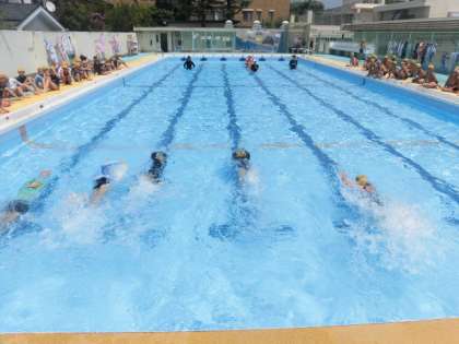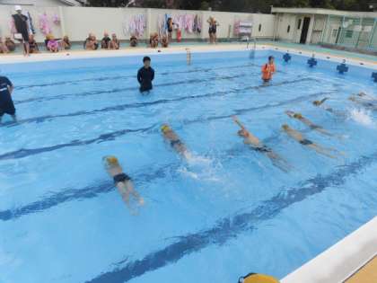 7月24日(火)から始まった夏休みの水泳指導の前期が今日で終了しました。猛暑の中で始まった今年の夏休みの水泳指導でしたが、大きな事故もなく終了しました。今日は、検定です。夏練習の成果を発揮して合格した人がたくさんいました。しばらくは学校のプールはお休みです。後期は822日(水)からです。これからの夏休み、川や海、プール等で泳ぐ機会もあると思います。安全に楽しく泳ぎましょう。