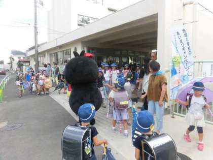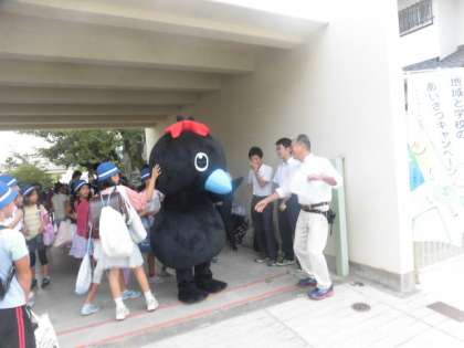 2学期のあいさつキャンペーンが始まりました。少し雨が降りましたが、地域のみなさん、烏山中学校のみなさん、からぴょんと一緒にあいさつをがんばりました。