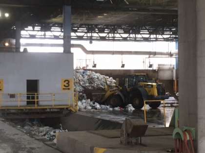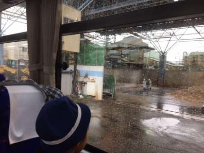 説明を聞いた後は、バスに乗って見学です。粗大ごみ破砕処理施設、不燃ごみ処理センターについて説明を聞きながら、バスの中から見ています。