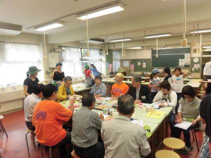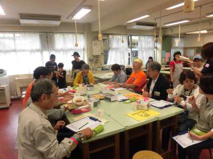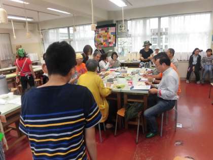 家庭科室室では、来賓の方に審査員になっていただき、それぞれの班のカレーを試食していただきました。班ごとにアピールポイントを説明して食べてもらいました。