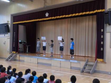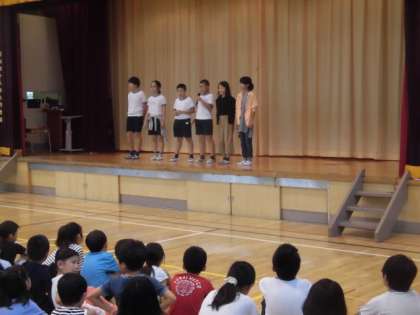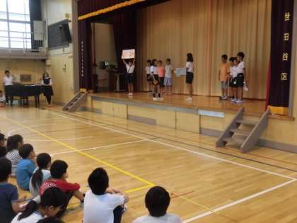 5・6年生が学校のために取り組んでいいる委員会活動。今日は前期の委員会活動の報告集会でした。保健・給食委員会、飼育・栽培委員会の二つの委員会が発表をしました。保険・給食委員会は、手を洗った時にハンカチを使うこと、鼻水は服でふかないことを劇で発表しました。飼育・栽培委員会は、クジャクバトを大切にしてくださいとお願いをしました。はじめて委員会の報告を聞いた1年生もしっかりと話を聞いて、委員会活動について理解することができました。