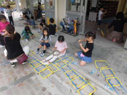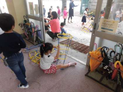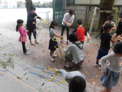明日、13日(土)にみんなで大切に育てたアサガオのつるを使ってリース作りをする1年生。今日は、自分で支柱にからまったつるをていねいにはずしました。保護者の方にも手伝っていただきながら、切れないように慎重に外していました。明日のリース作りが楽しみです。