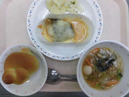 あしたばパン・魚のチーズ焼き・パセリポテト・白菜と春雨のスープ