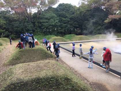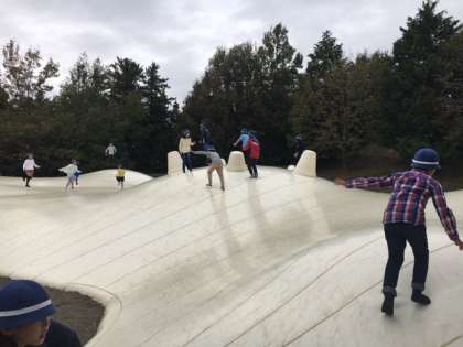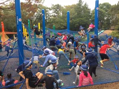 グループごとに遊んでいます。まだ武蔵丘小学校しか来ていないようで、たくさん遊べます。この前の台風で木が折れて立ち入り禁止のところもあります。みんなで気をつけて、楽しく遊びます。
