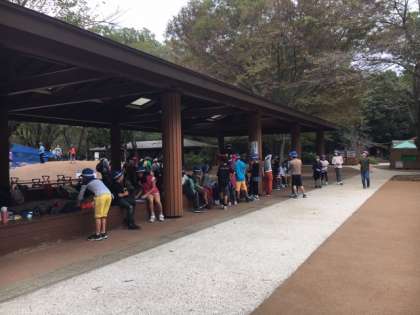 こどもの森でのグループでの遊びを終えて、集合場所に戻ってきました。たくさん遊んで喉がかわきました。