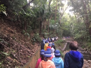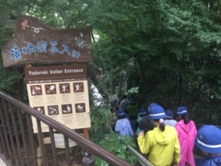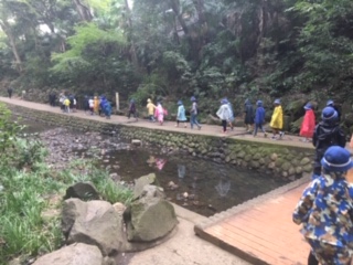 二ヶ所めの見学は、等々力渓谷です。階段を降りて谷沢川に沿って歩きます。緑がいっぱいです。
