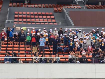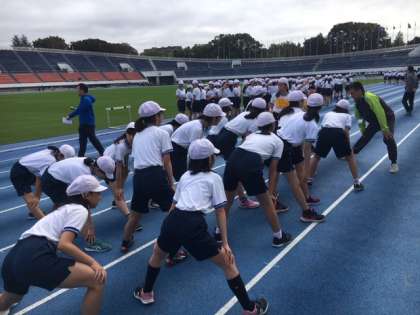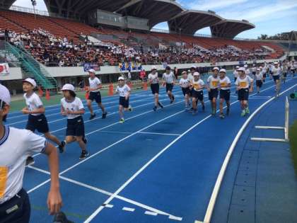 開会式は、スタンドの自分の席で話を聞きます。開会式の後、グランドに降りて400mトラックを走ります。