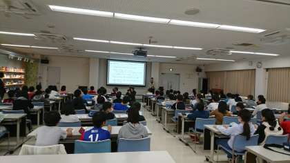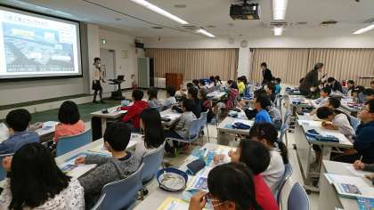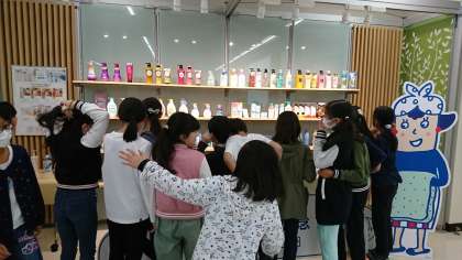 花王の製品の多さにびっくりしている子どもたちです。花王のお仕事についてお話を聞いてます。