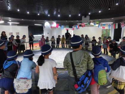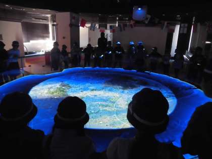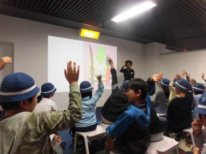 英語学習は、昨年度まであった郷土資料室を改装した「Touch the World」という施設で行います。世田谷区の大きな立体地図の上に映し出されるジオラママッピングの映像と英語の説明で「世田谷区」や「世田谷区と世界のつながり」について学習します。その後は、英語の絵本「Ninjin,Gobo and Dikon」の読み聞かせを聞いて、ALTの先生の質問に答えたり、一緒に発音したりしました。