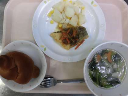 ココアパン・魚のマリネソース・コーンポテト・白菜のスープ