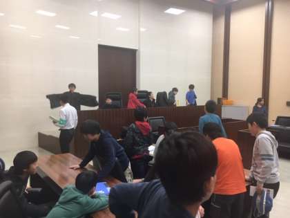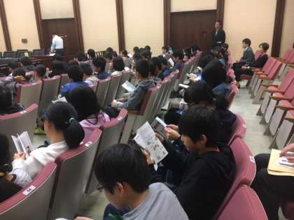 裁判所の働きについて説明を聞いた後、模擬裁判をしました。裁判官などの役になった子がしっかりとシナリオに沿って話をしたのでよく分かりました。裁判の結果は家でお聞きください。模擬裁判の様子は、写真撮影可でしたのでご覧ください。この後、江戸東京博物館に向かいます。