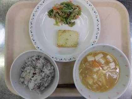 ゆかりごはん・イカの七味焼き・野菜のごまみそかけ・具だくさんみそ汁