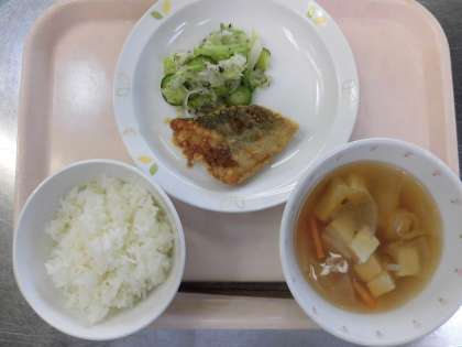 ごはん・魚のかわりソースかけ・野菜のゆかり和え・のっぺい汁