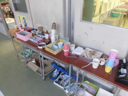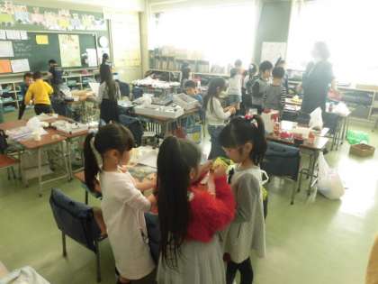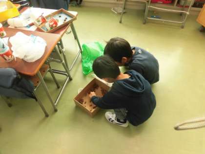 1年生が生活科でドングリや松ぼっくりを使った工作をしています。やじろべえを作ったり、遊ぶおもちゃを工夫してつくっています。とても工夫した工作がたくさんできあがっています。