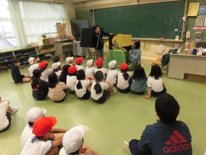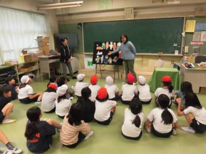 今日は3年生が、いつもは図書室でお仕事をしている図書事務の坂本先生と柘植先生に読み聞かせをしていただきました。大きな絵本を読んでいただいたりして楽しい時間を過ごしました。