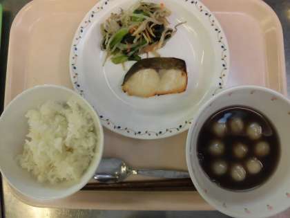 ごはん・魚の西京焼き・野菜のからしじょうゆあえ・しらたましるこ