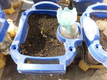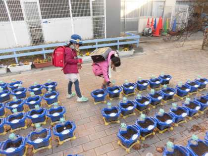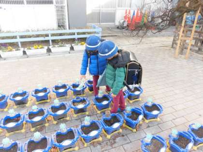1年生が大切に育てているチューリップ。まだまだ寒い中、元気に芽をだしてきました。早く大きくなれと水やりを毎日忘れずにがんばっています。