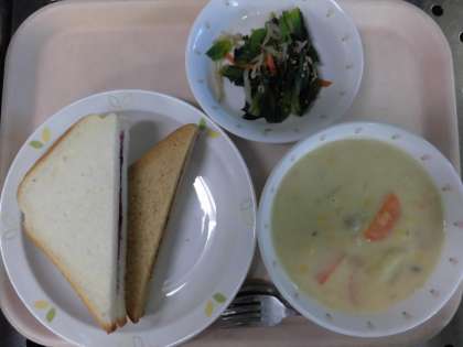 ダブルジャムサンド・コーンシチュー・青菜の乾物和え