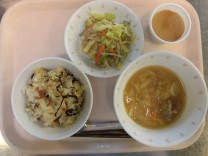 野沢菜ごはん・ムロアジのみそスープ・野菜の中華味・ほうじ茶プリン