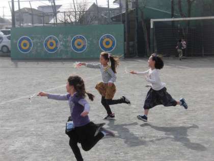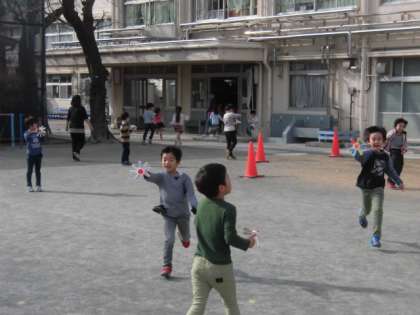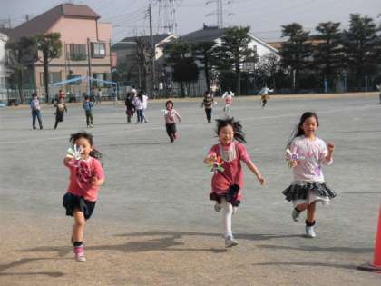 天気の良い校庭で、1年生が自分で作った風車を回しています。風が弱かったので、元気に走り回って、力いっぱい回しています。